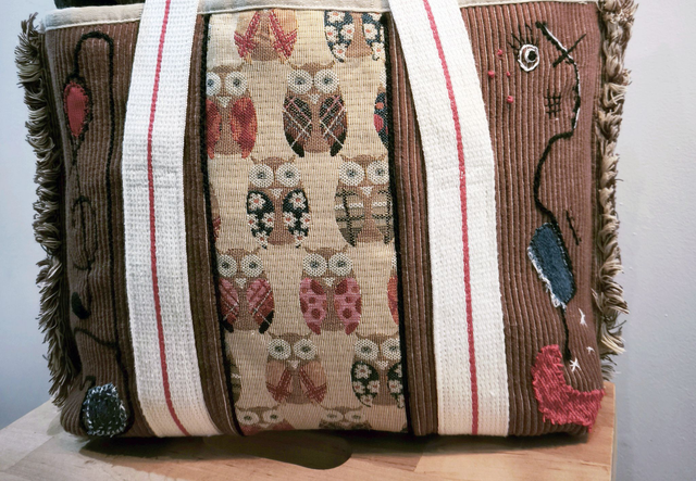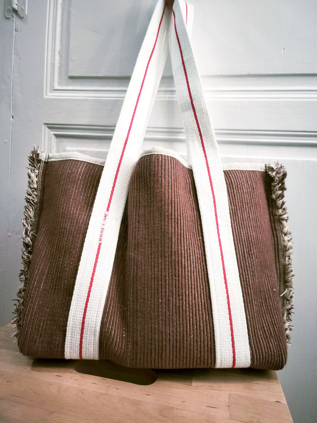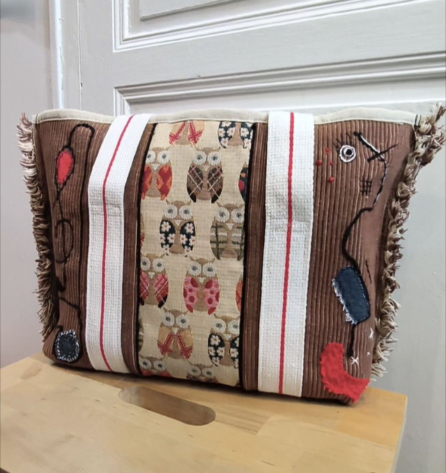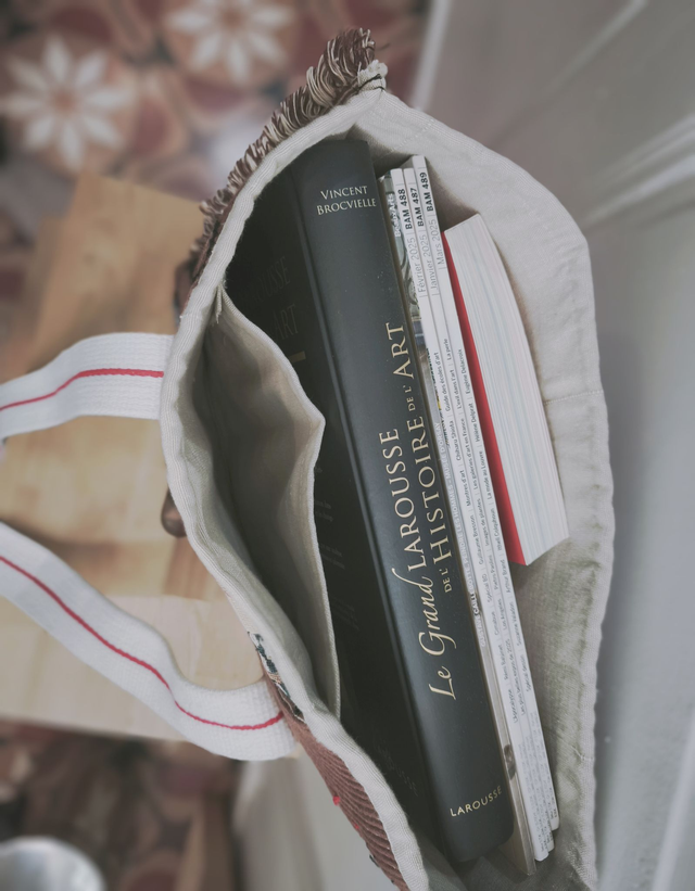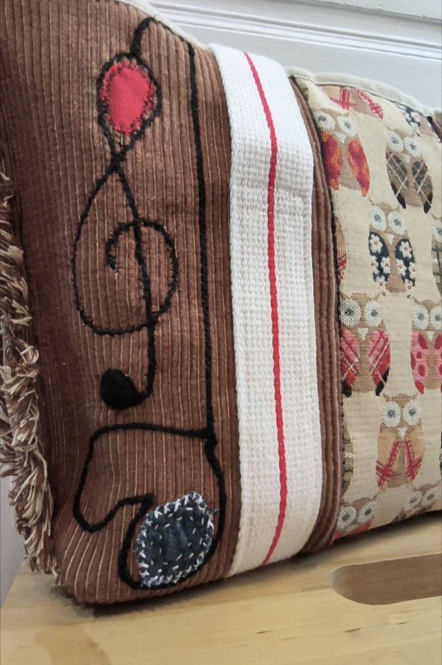 L'idée de départ : fabriquer à partir de sets de table et d'une ceinture de karaté, un sac art et bohème, de taille moyenne mais suffisamment solide pour transporter une encyclopédie sur l'histoire de l'art, quelques autres livres ou revues, carnet de croquis et porte-mine. On y ajoute un graphisme musical, des touches de couleurs en pièces de sashiko et un tissu amusant très chouette. Tadaaaaam !